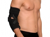 Confeccionado en Neoprene Velcro® Plush. Proporciona sujeción universal de bíceps y tríceps. Articulación bilateral para control de flexo/extensión y medial/lateral. Aplicada para estabilidad moderada, con strap en “X” para control de hiperextensión.